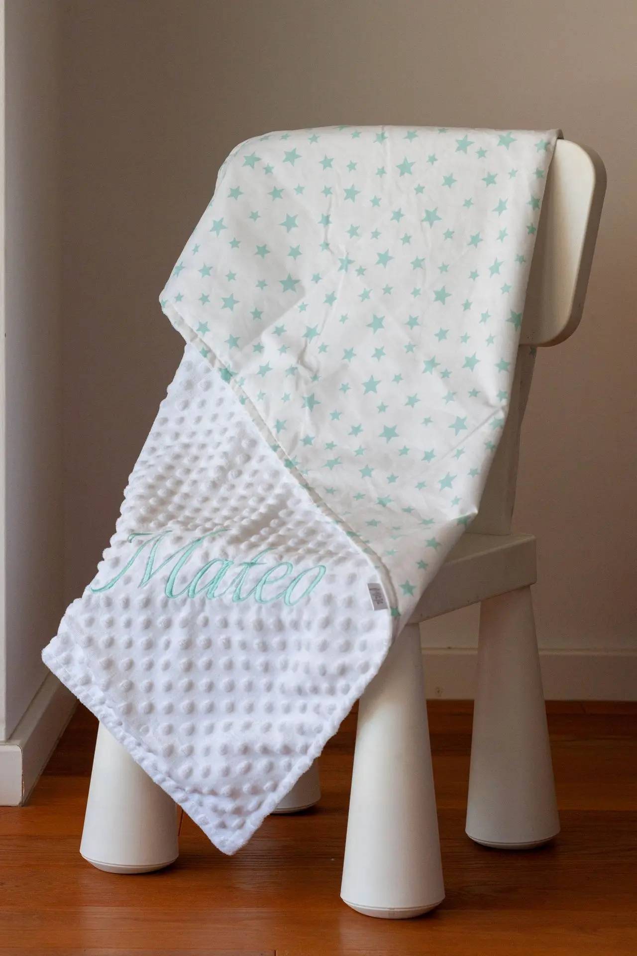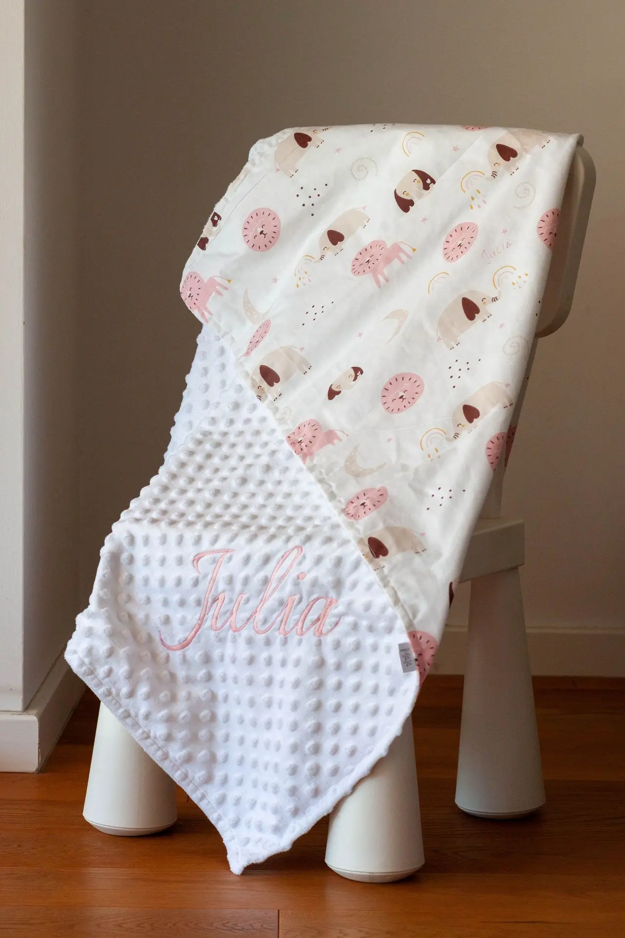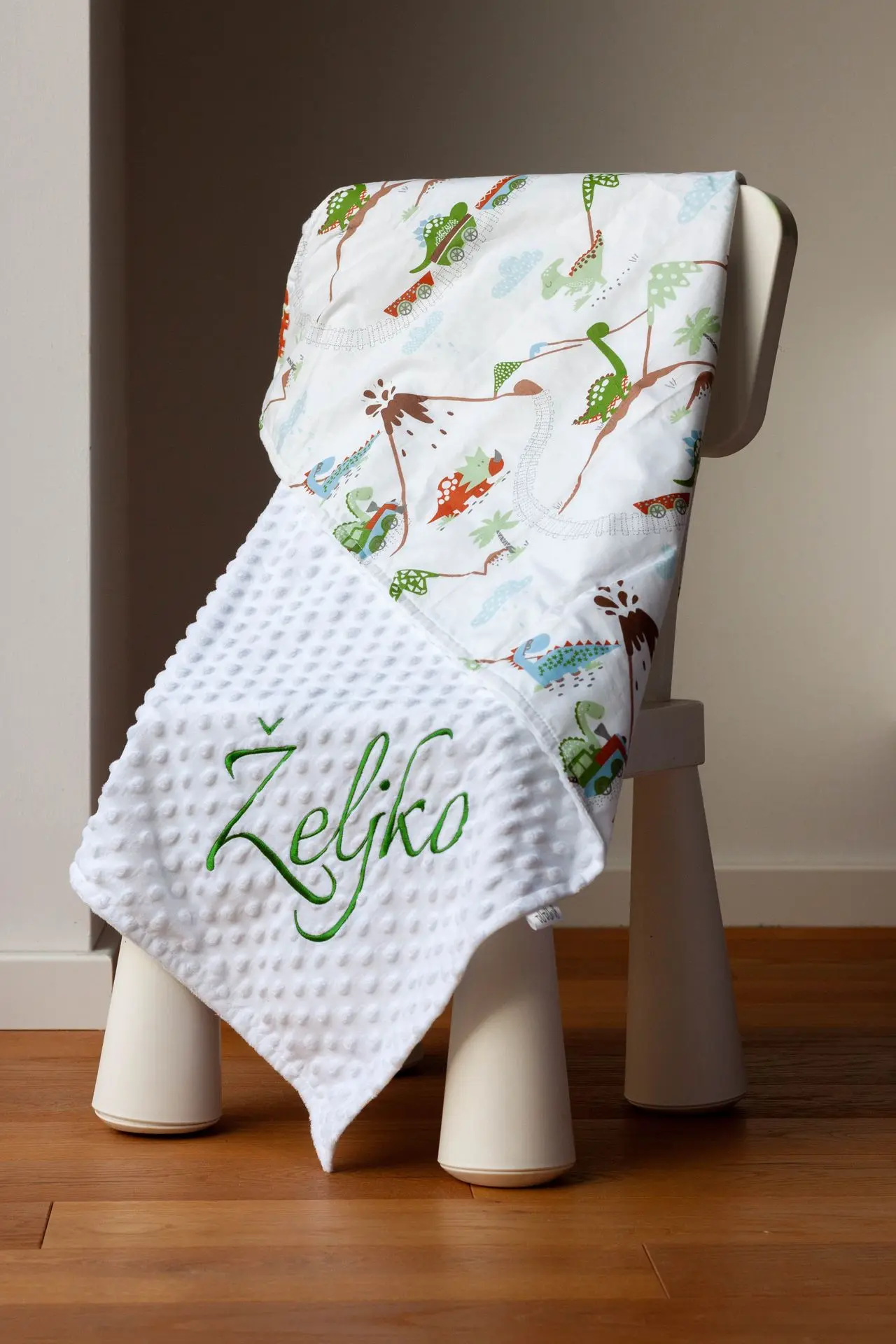 Mekana i topla dekica, kombinacija minky materijala i pamuka, dimenzije 100 x 70 cm. Personaliziran poklon za rođenje djeteta.