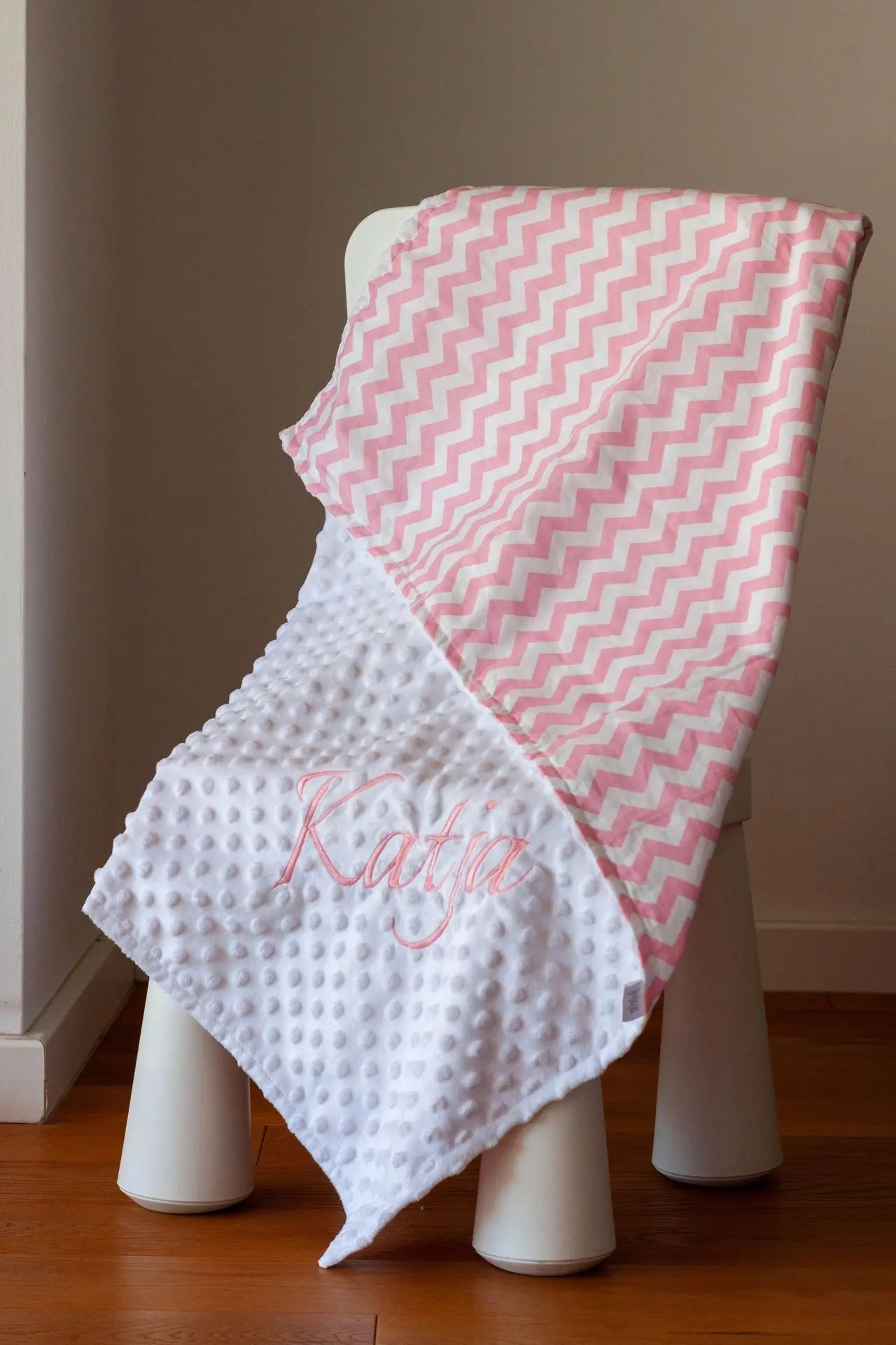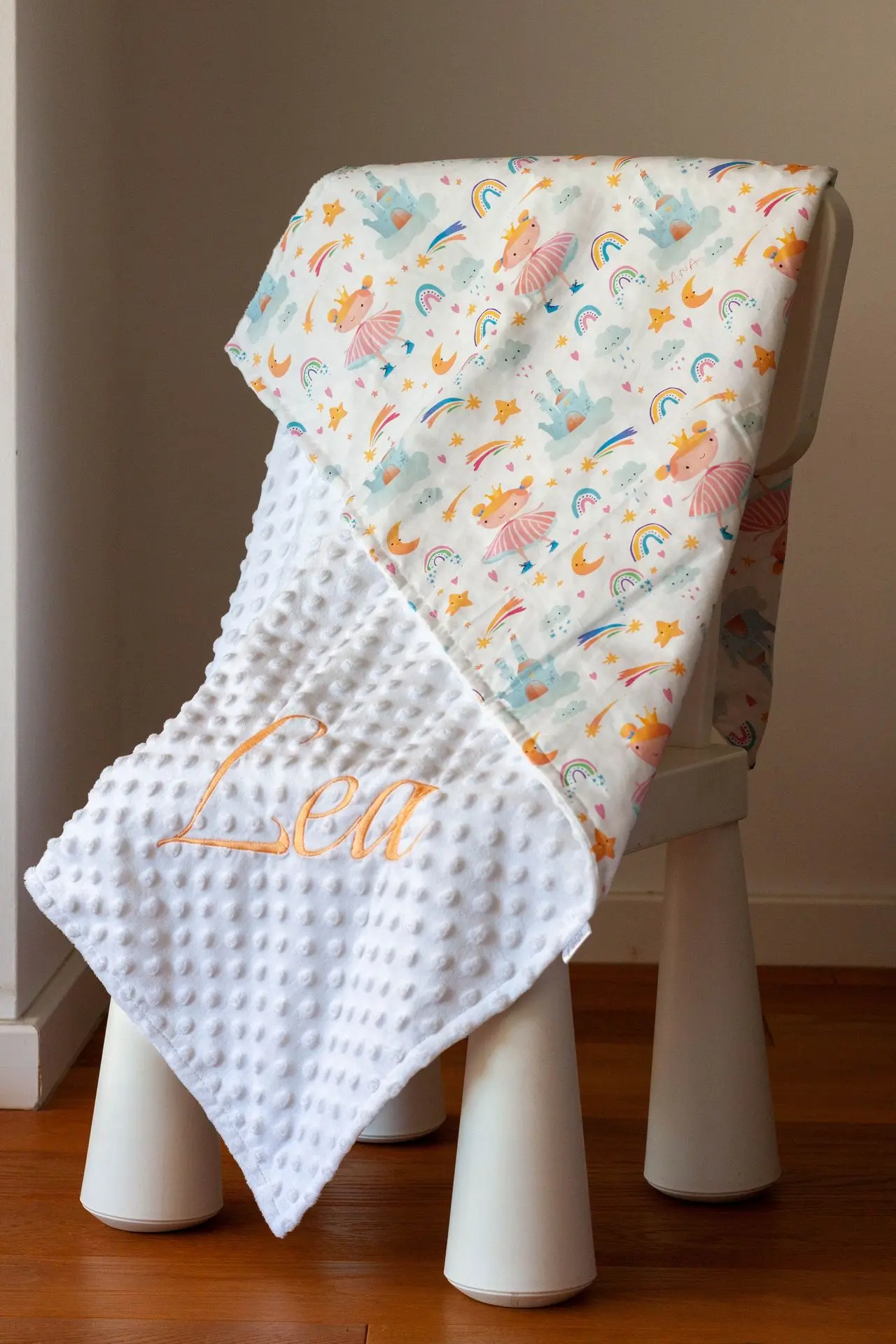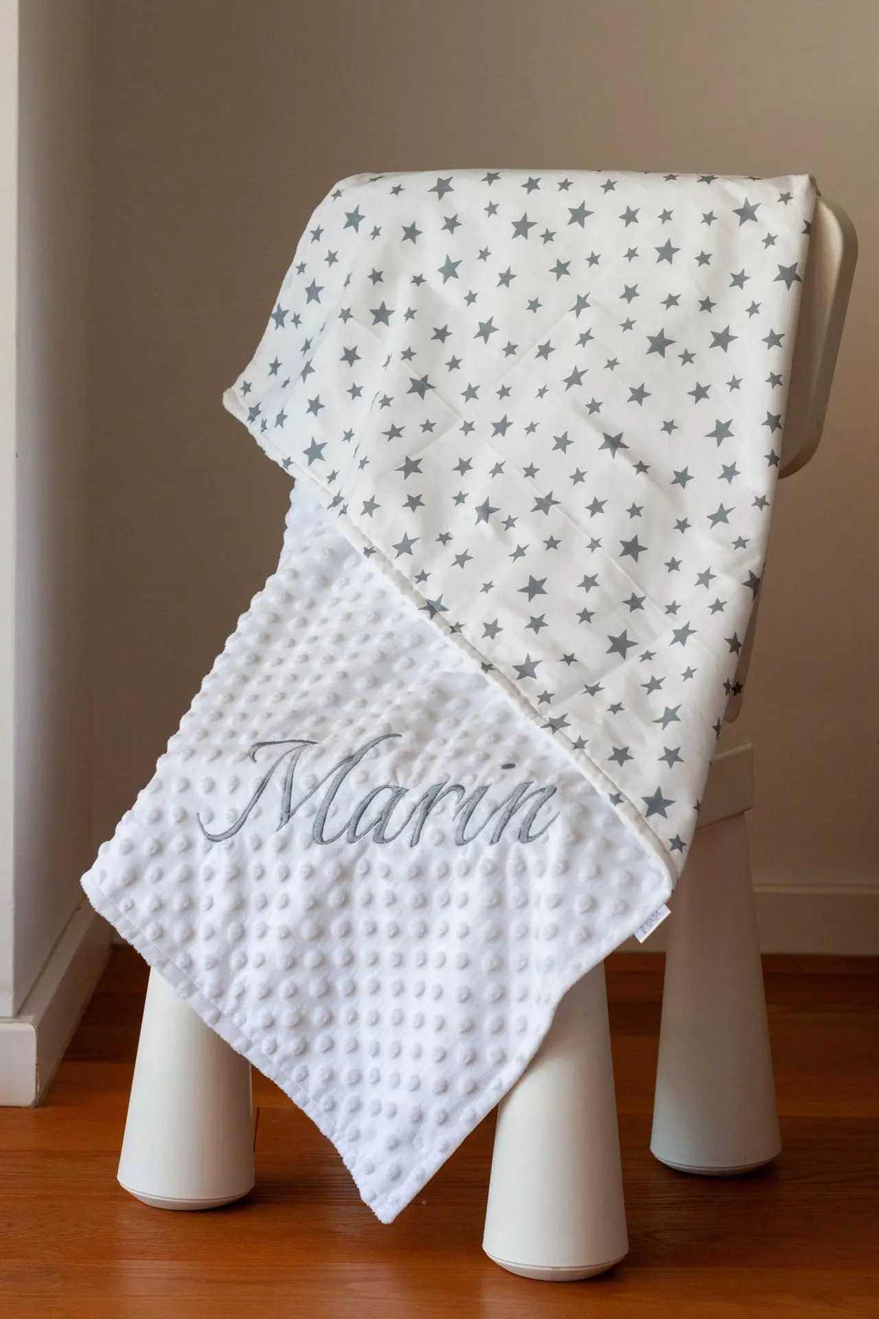Mekana i topla dekica, kombinacija minky materijala i pamuka, dimenzije 100 x 70 cm. Personaliziran poklon za rođenje djeteta.
